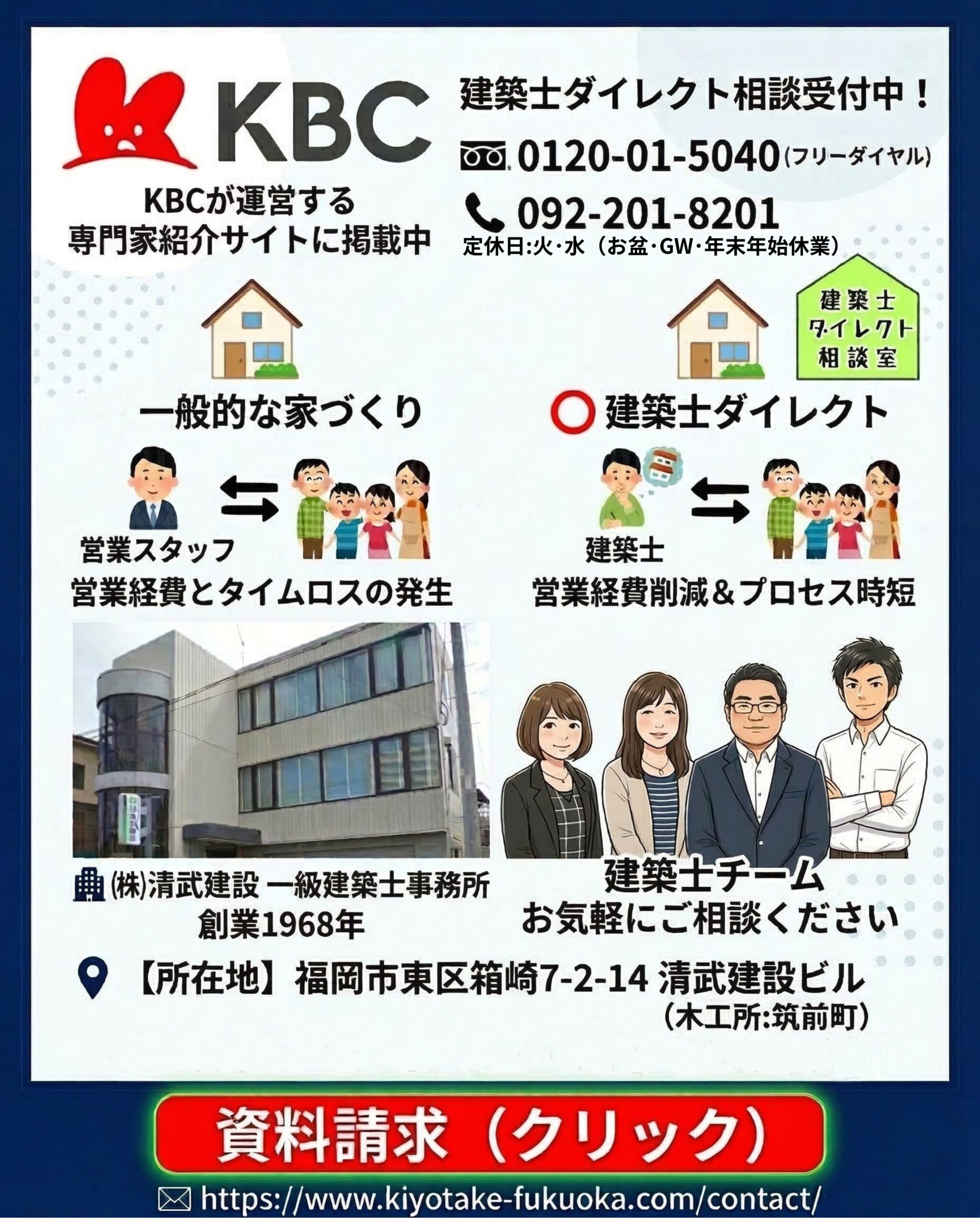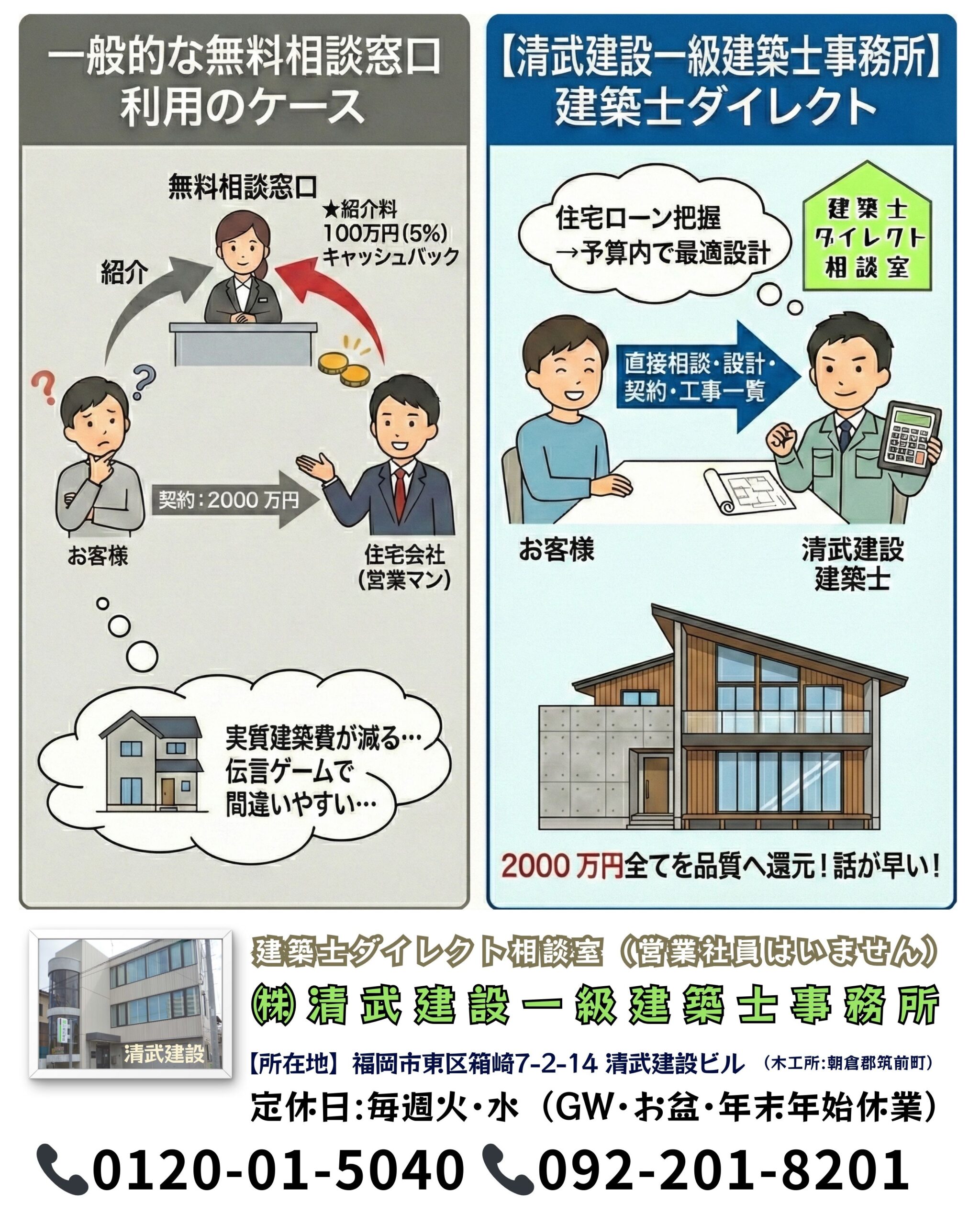 昭和43年(1968年)創業の㈱清武建設一級建築士事務所は、福岡市東区箱崎を拠点に、営業マンを挟まずにお客様と建築士が直接打ち合わせをする「建築士ダイレクト」の家づくりを行っています。