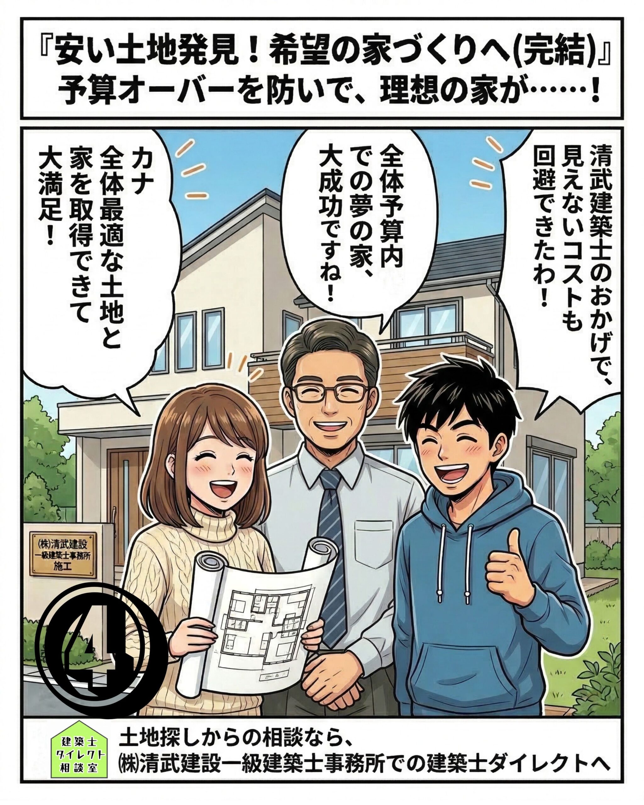 今回は、土地探しから始める家づくりで、後悔や予算オーバーを防ぐための重要なポイントを、4コマ漫画で分かりやすくご紹介します!