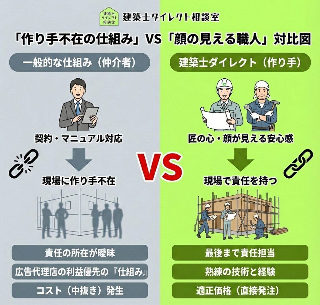 合理的に考えれば、「お客様」と「職人・建築士」の間に、価値を生まない仲介者(レントシーカー)は要りません。
