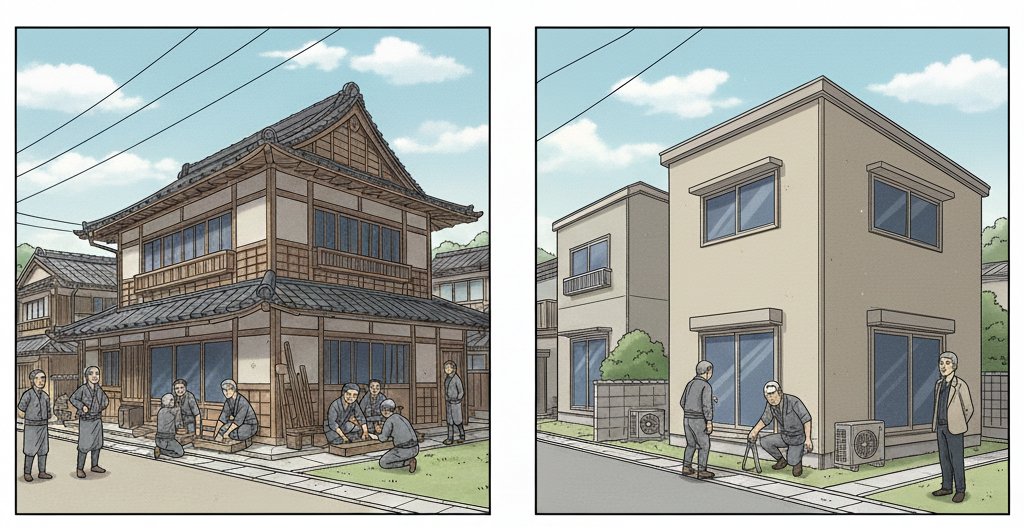 かつて、昭和の家づくりはもっと素朴だった。近所の大工に直接頼む。そこには「お客様」と「つくり手」の、体温が伝わる距離感しかなかった。