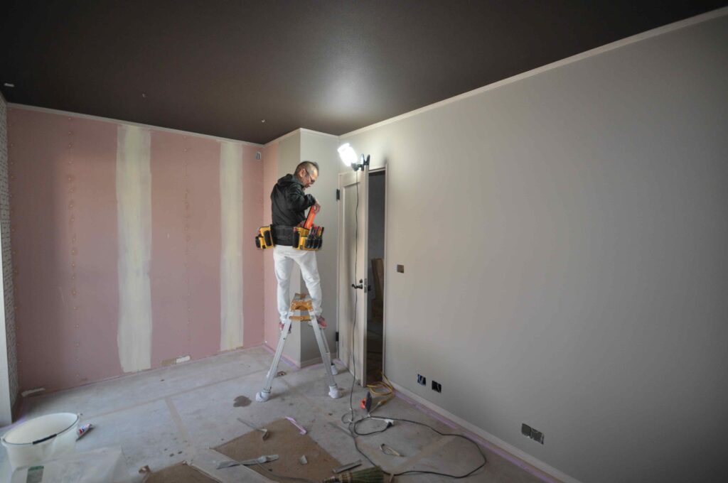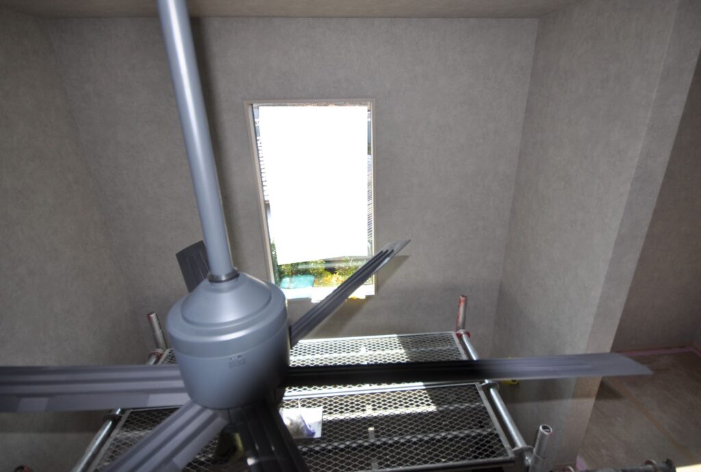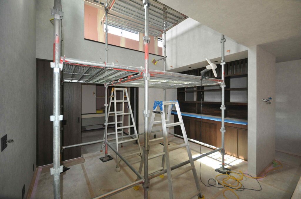 吹き抜け部分の壁紙工事状況