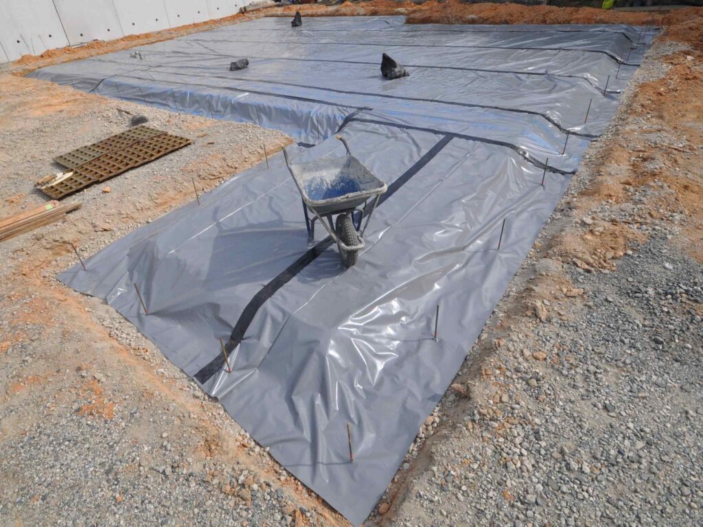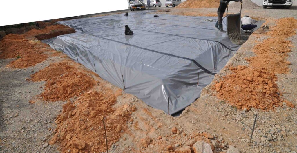グレー色のシート上部に、後日の工程で、鉄筋を組みます。このシートを敷き、基礎完成後の補足工事によって、20年間の白蟻(シロアリ)保証が発行されます。以前は、防蟻剤の散布後、「防湿効果のみ」の透明なシートを敷き、その上に鉄筋を組んでいましたが、下記グレー色のシートは、 忌避剤を含有し、薬剤散布と違い、地下に浸透しない為、防蟻、防湿効果が持続します。