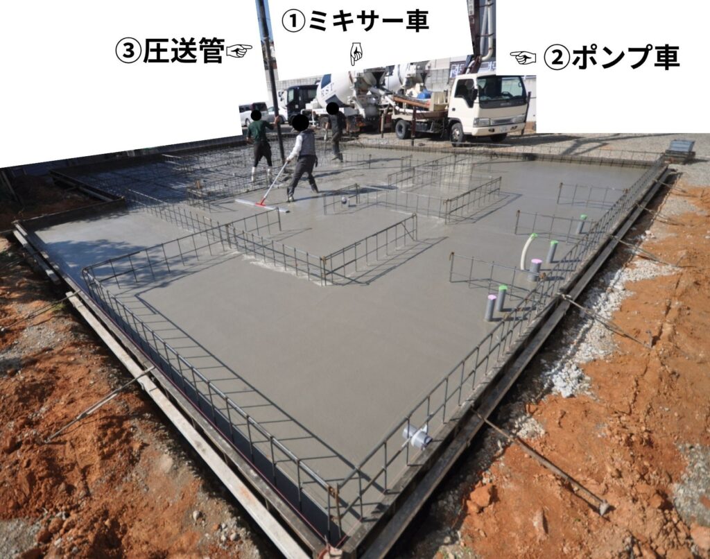 ①ミキサー車が運ぶ生コンを②ポンプ車が受け取り、③ポンプ車の③圧送管にて、コンクリートを打設する位置まで送ります。
