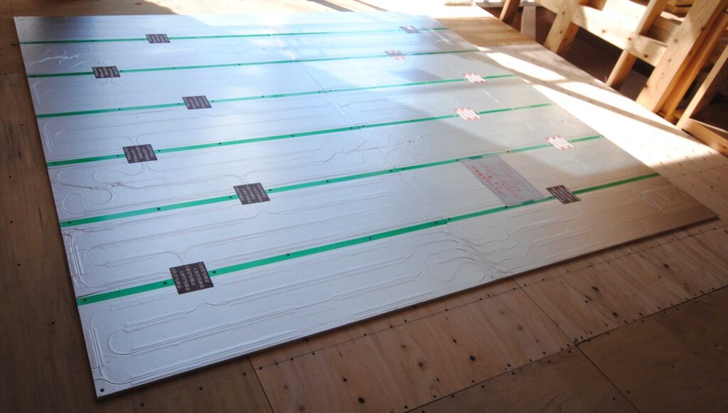 スウェーデンの工場では、工場で働く労働者を守る為に、25V/m以下にする基準があります。日本の住宅は、測定すると、200v/mを超えます。その改善の為、この緑のシートで、電場を吸収し、埋め込んだアース棒より地面に流します。