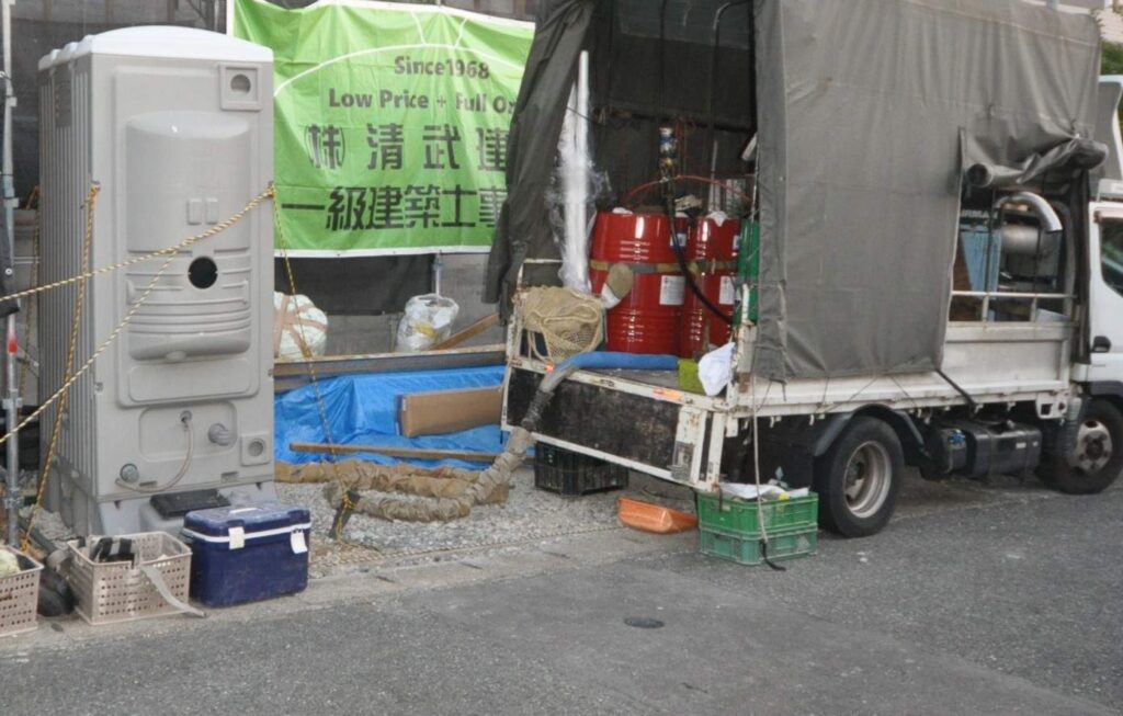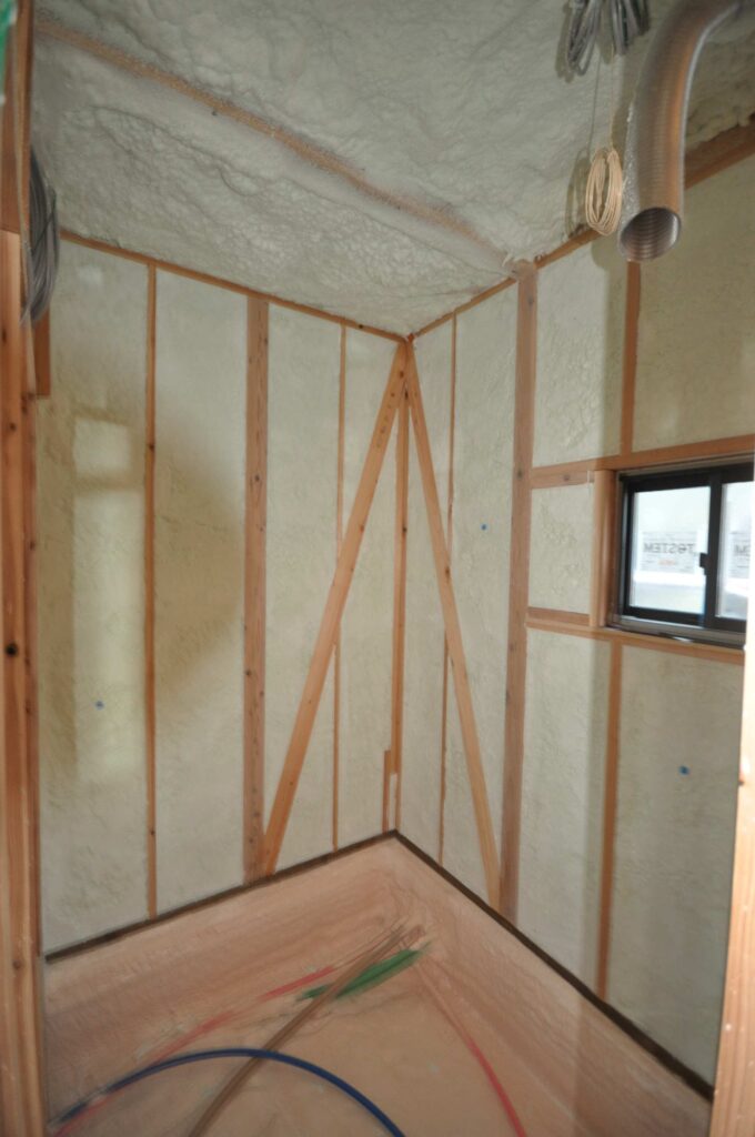 車両荷台より、発泡ウレタン材を室内へ圧送し、天井、壁、床に吹き付けます。