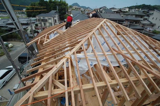 ※瓦屋根の下部の板(野地板)は、近年、人件費カットの理由等で、「合板」を貼る住宅会社が9割以上ですが、弊社は、「杉板」を貼っています。何故なら、ホルマリン臭が漂う「合板」の場合は、個人差はありますが、頭痛、シックハウスになり、弊社では、家の匂いが全く違う、木の香る住まいを建築しています。
